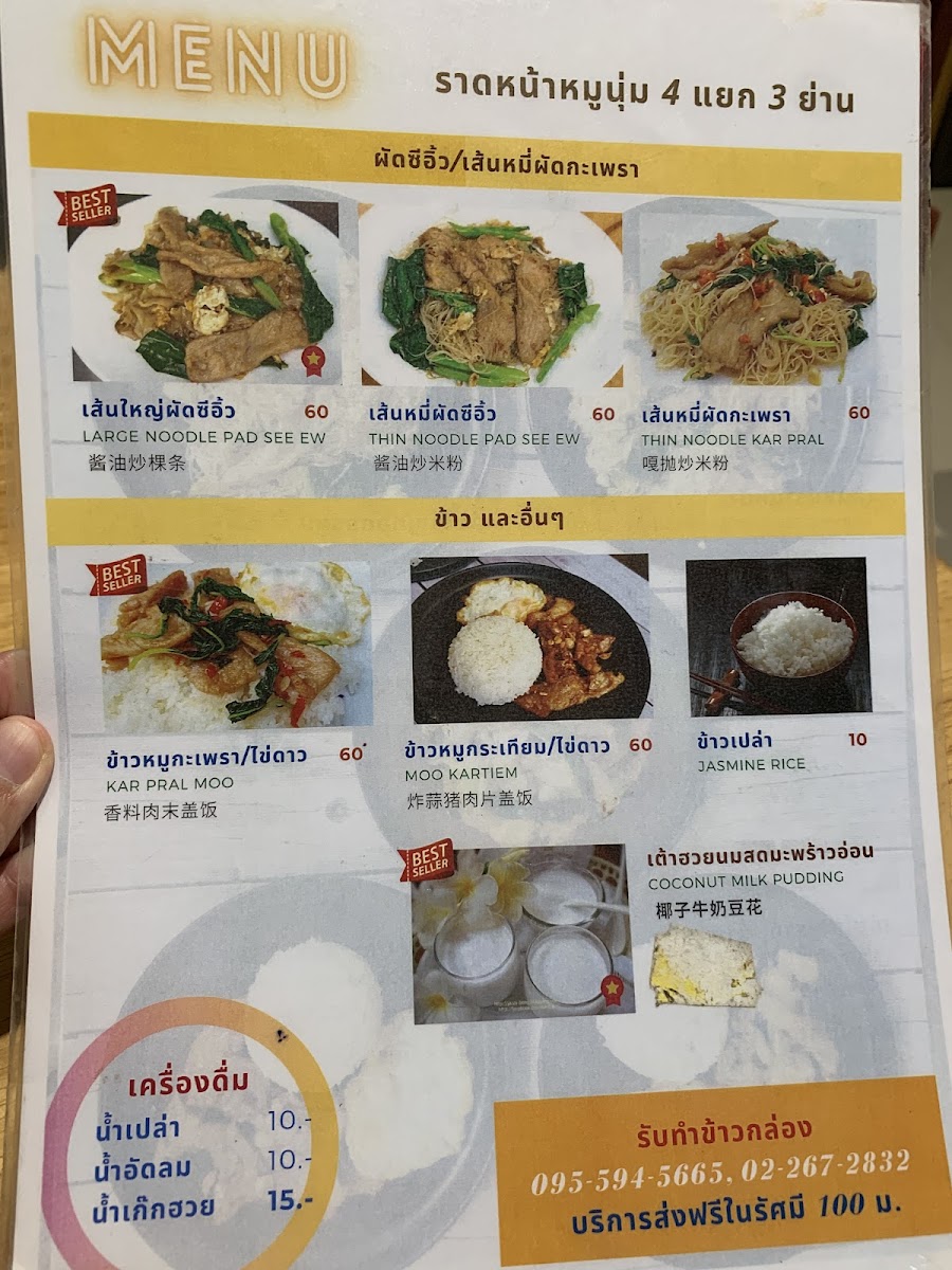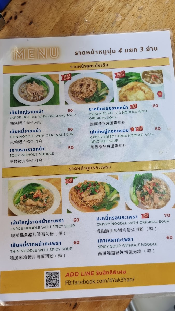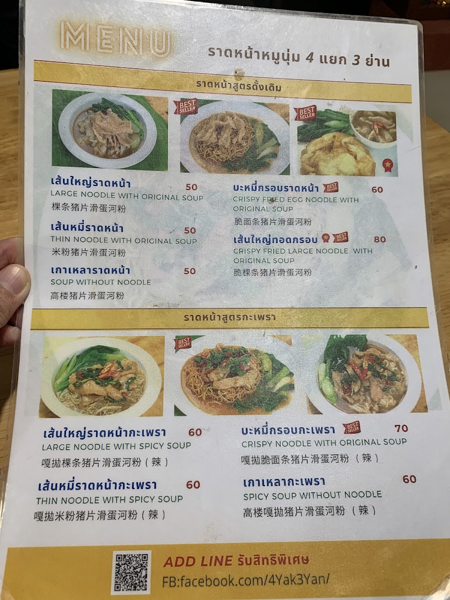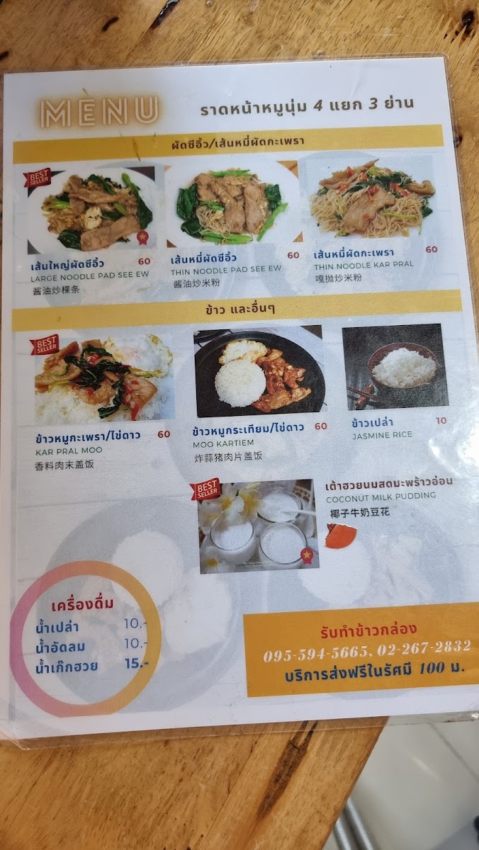 The menu offers a variety of dishes beyond the signature rad na, including flavorful options like Kar Prai Moo with a sunny-side-up egg served with rice – a personal favorite for its balance of spices and textures. Prices are reasonable, making it an ideal spot for quick, fulfilling street-style dining with a touch of comfort. Friendly service and a no-queue environment add to the overall pleasant experience, making Rat Na Sam Yan a must-visit for anyone craving genuine Thai-Chinese cuisine.